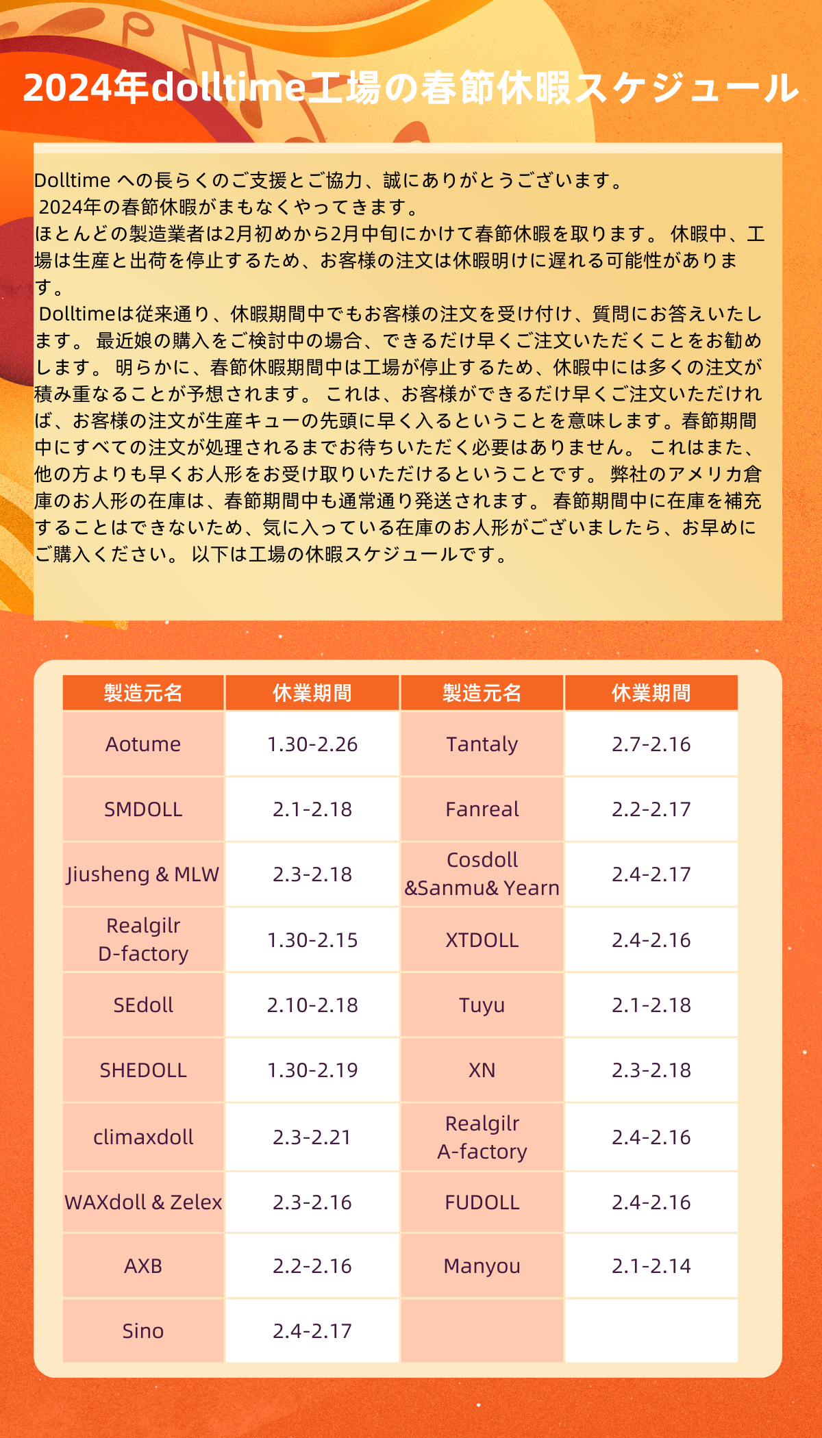 2024年のdolltime各工場の春節休暇スケジュール